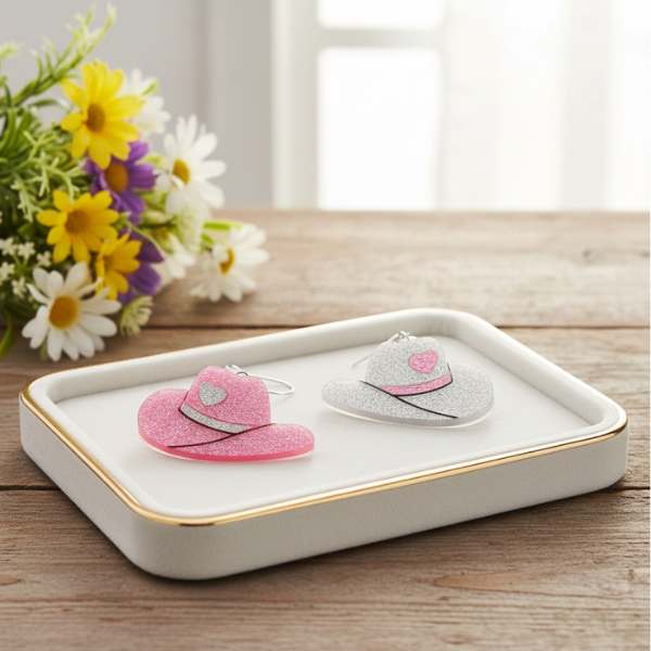 Saddle up, sparkle queens! Our glitter cowgirl heart earrings in white and pink bring rodeo glam with a side of sass. Giddy-up and glow!