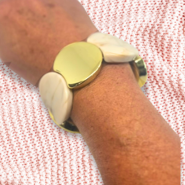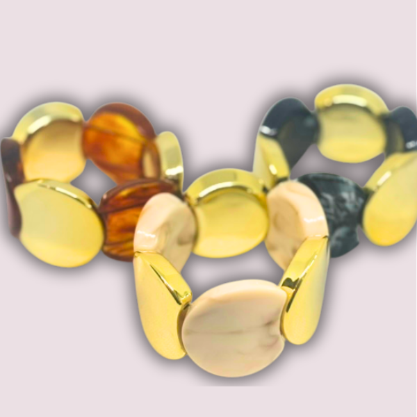 Turn up the glow with the Solaris Bracelet — bold, glossy acrylic meets radiant gold for a retro-luxe statement that shines from day to night. Available in warm amber, creamy ivory, and sleek black, this stretchy slip-on stunner is made for stacking, mixing, and sparking conversations.